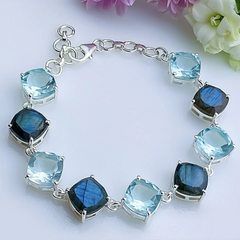 - > Pulseira ajustável de prata 925 com pedras naturais topázio azul e labradorita (PB462)